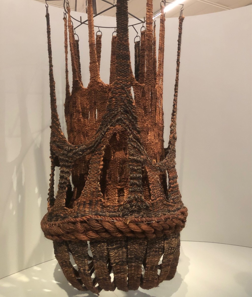 Onderstaand werk is moeilijk te categoriseren is: het is geweven, maar het is allesbehalve een wandkleed. Het lijkt een monumentaal beeld, het kan echter niet staan: het hangt aan sterke kabels. Het werk is groot, een diameter van minstens vijf meter schat ik.