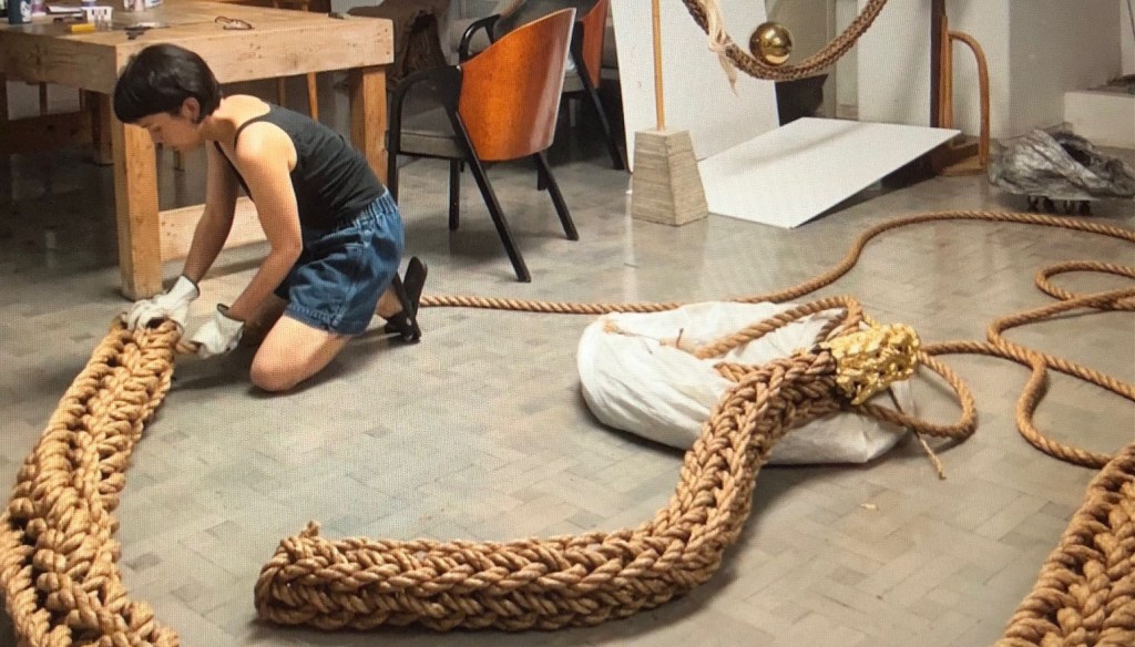 Het weefwerk van Wilhelmina Fruytier (hieronder te zien) is gemaakt van kunststof touw.